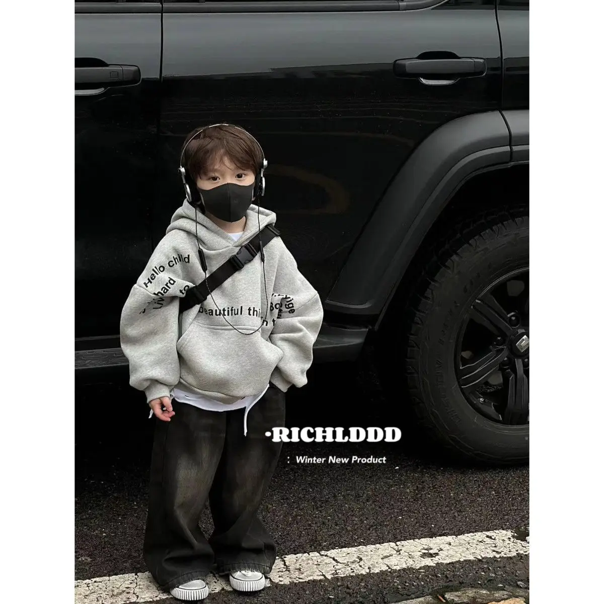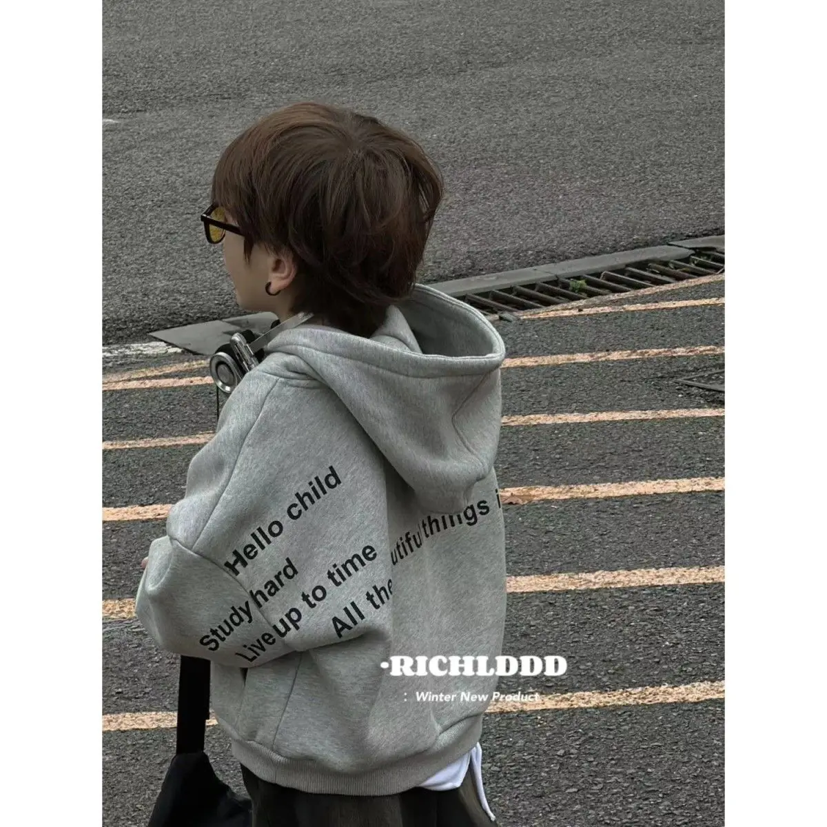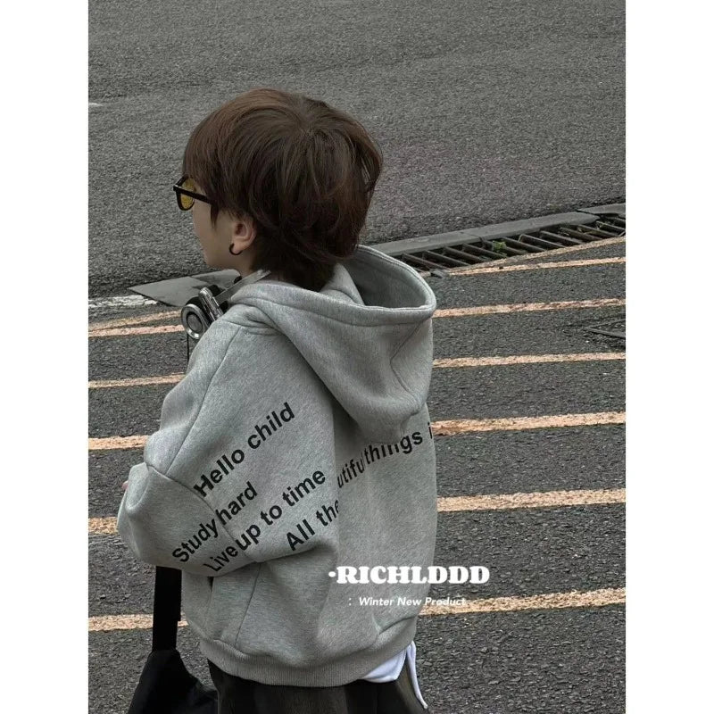 2025 Autumn/Winter Plush Letter Children's Hoodie Baby Sweater Korean Edition Fashion Children's Cool and Handsome Warm Top