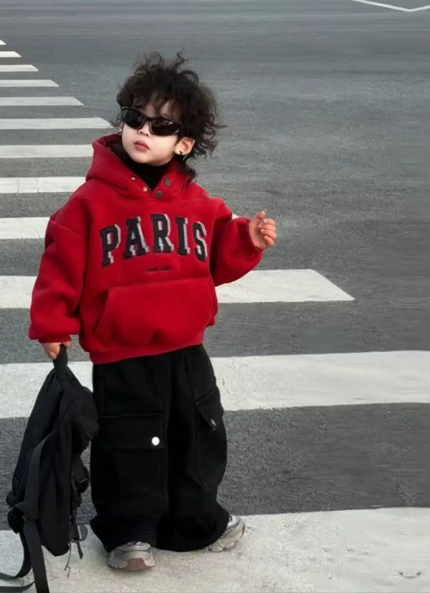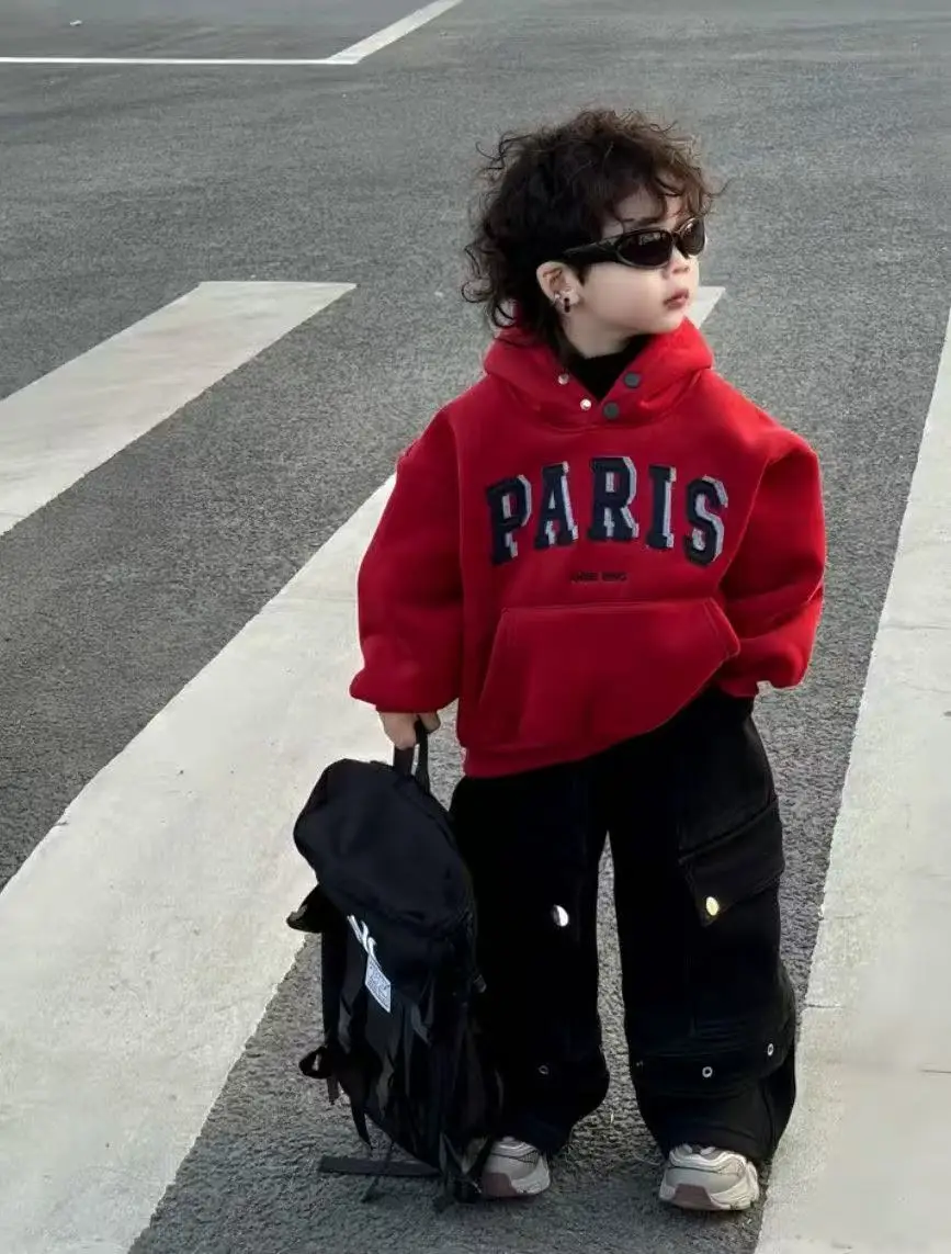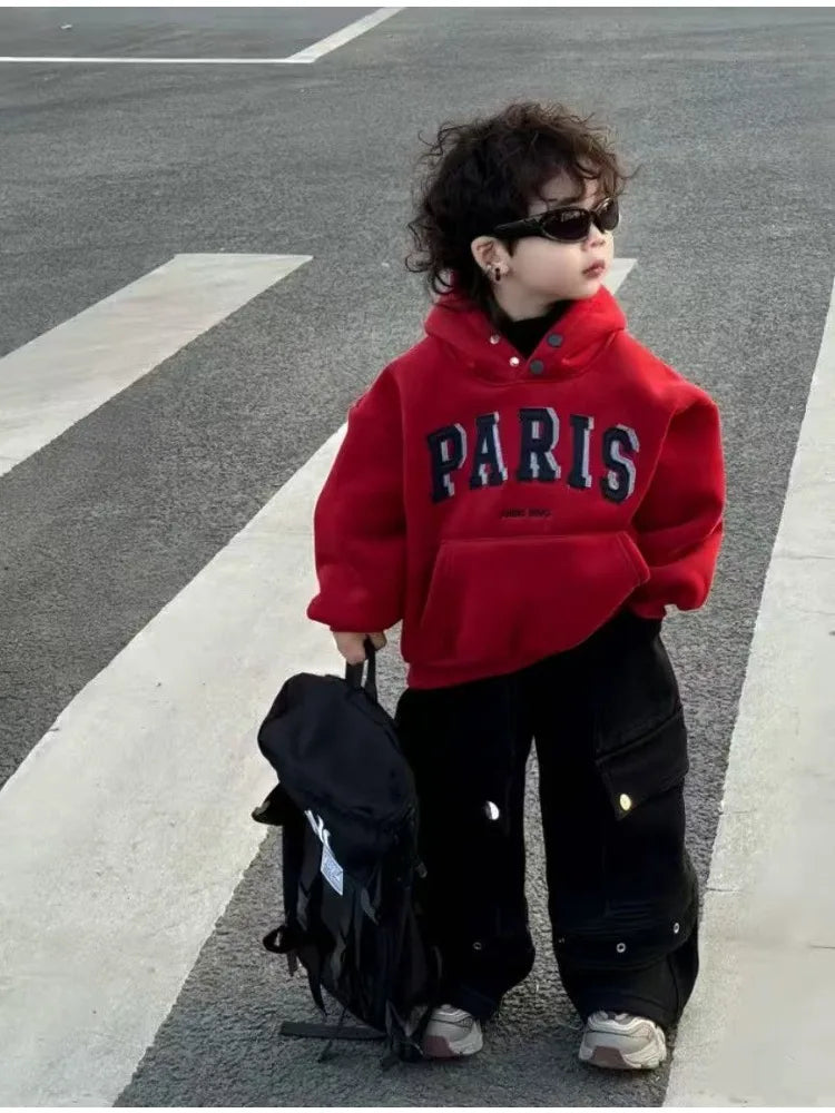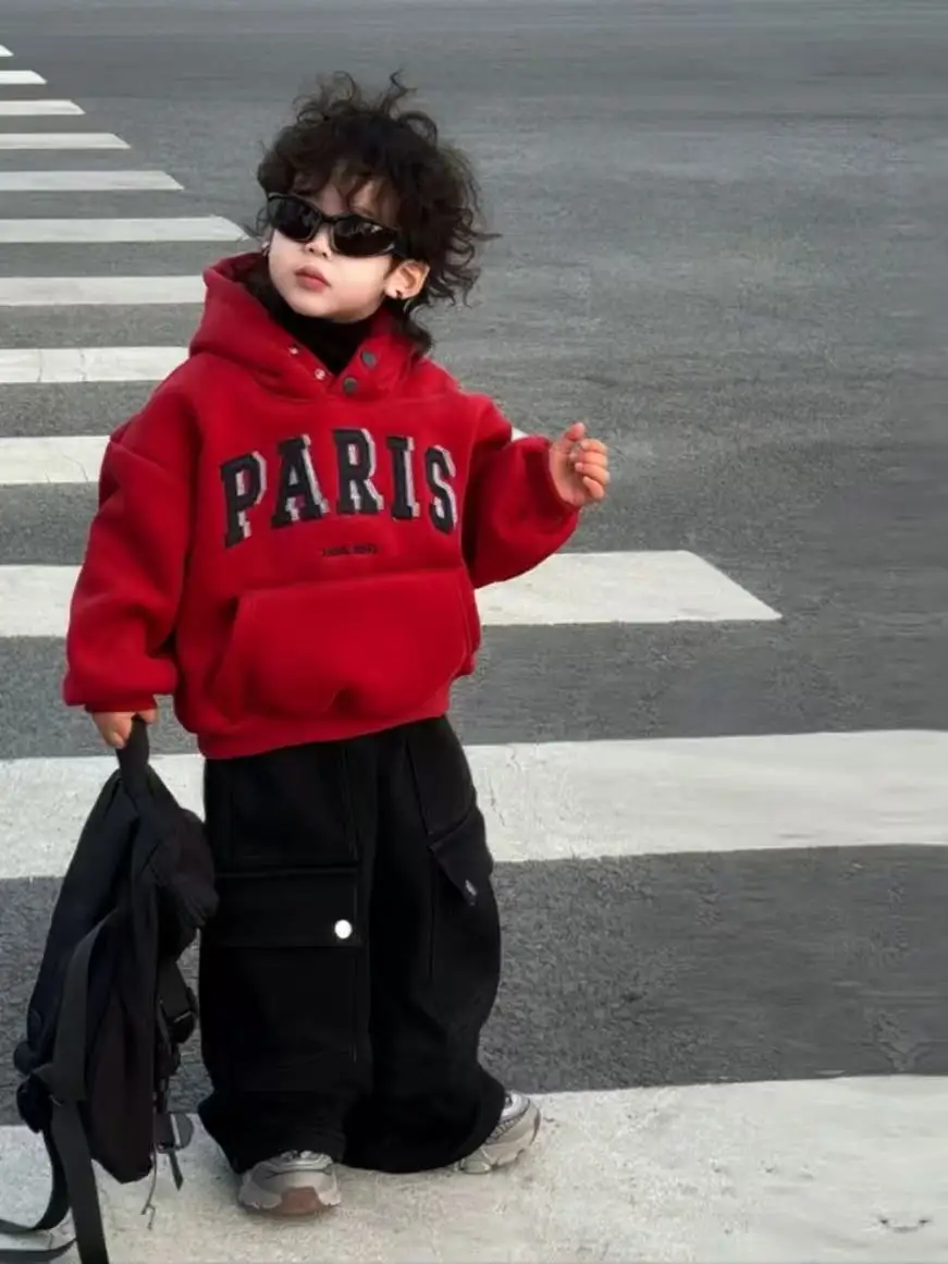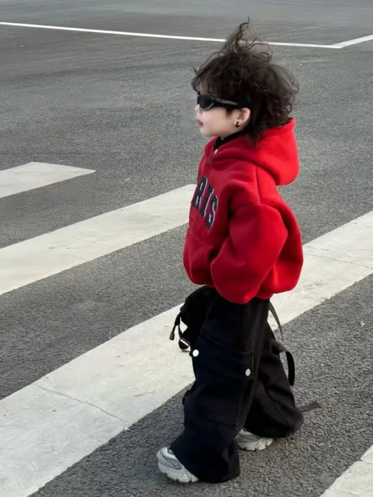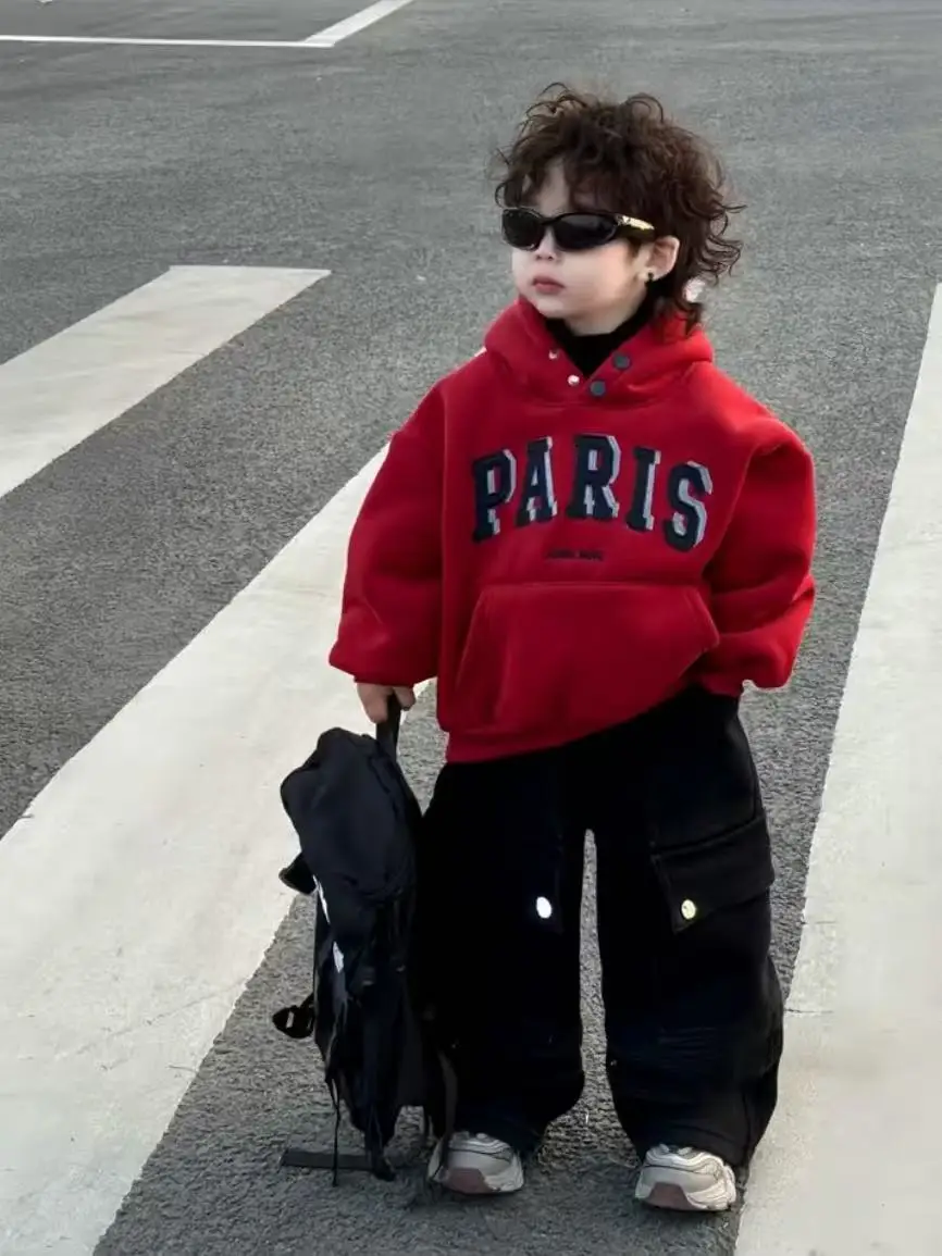Boys Red Fleece Set 2025 New Year's Clothing Baby Autumn and Winter Hooded Sweater Casual Pants Two-piece Set